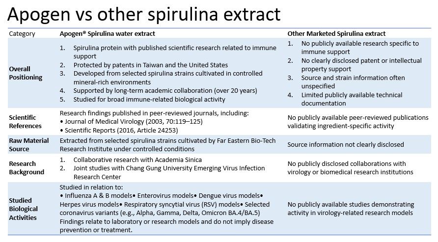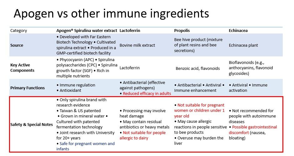 Apogen® spirulina water extract differs from commonly used immune ingredients such as lactoferrin, propolis, and echinacea by offering broader applicability and a more inclusive safety profile. While lactoferrin is dairy-derived and may not be suitable for individuals with milk sensitivity, and propolis or echinacea are often cautioned for use during pregnancy due to allergy or immune-stimulation concerns, Apogen® is derived from carefully cultivated spirulina and has been studied for its biological activity in a range of research models. Its gentle, food-based origin and long history of academic collaboration support its positioning as a more broadly applicable immune-support ingredient, including suitability for pregnant women when used as directed. This makes Apogen® a versatile option for populations seeking daily immune support with a higher margin of safety.